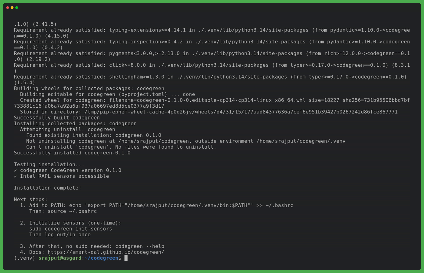 Installing CodeGreen via the automated installer script which handles dependencies and C++ compilation.