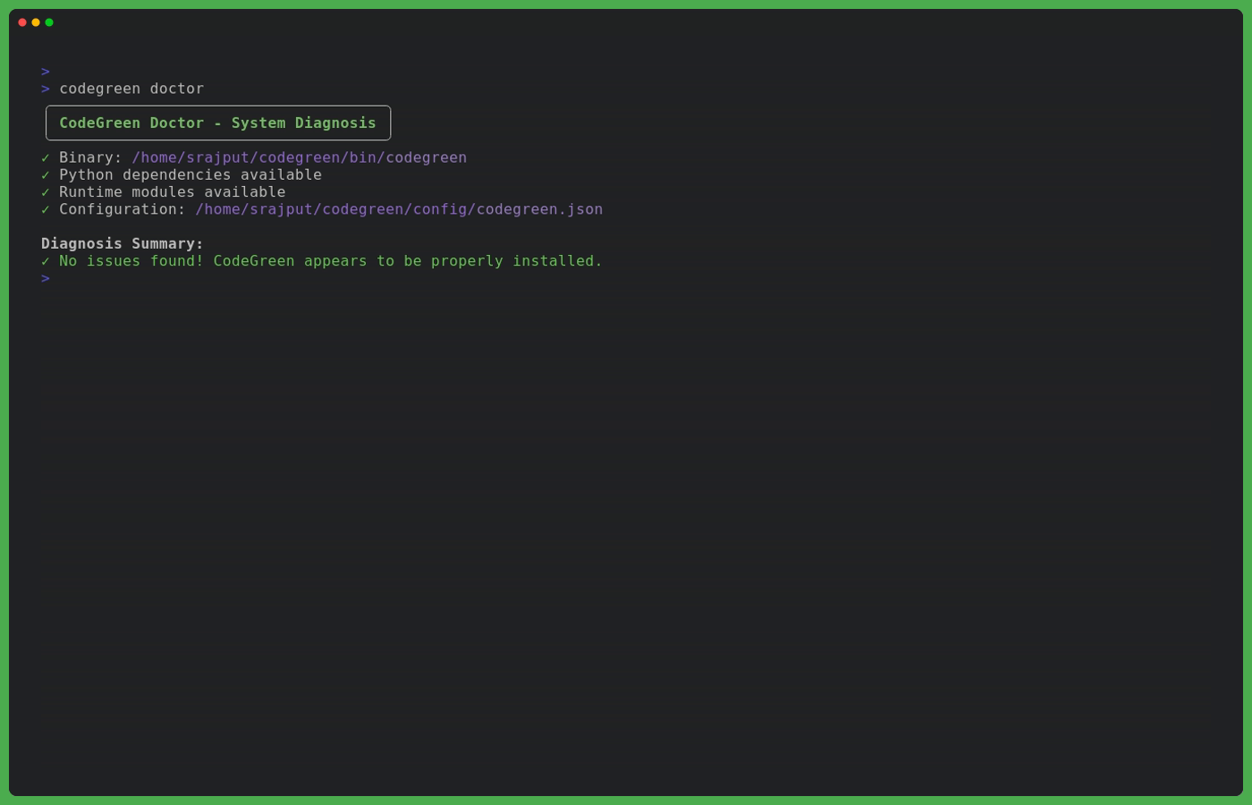 Running the CodeGreen Doctor to diagnose and fix potential configuration or dependency issues.